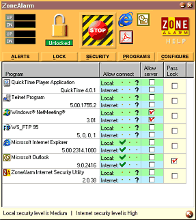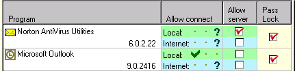 Click on the Programs button to view the expanded Program panel. The program panel contains a list of all programs that have attempted to access the Internet. You can review and set each program's access rights for the Local Zone and/or the Internet Zone. The Allow server checkboxes let you control which applications can perform server functions. The Pass Lock column lets you decide if an application can connect even though the lock is engaged. Any application in the list can be removed.