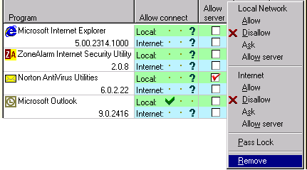 Checking the Pass Lock check box allows a program to bypass the Automatic Lock . Use this feature to allow an e-mail program to check for new mail even when access to all zones is locked. You can also use this feature to allow server applications to bypass the Automatic Lock. If you have an FTP, or Web server application running on your computer, the Pass Lock button will allow you to let those applications remain connected to the Internet. Note! When the Emergency STOP button is pressed, all Internet access will be denied including applications that have been given Pass Lock rights. If one of your programs generates errors regarding an Internet connection, it is possible that it attempted to access the Internet when the Automatic Lock was engaged. If you want to allow this, be sure to check the Pass Lock checkbox. 6.5 Program Removal and Local Menu To remove a program from the list right-click on the program entry and select the remove option. Removing a program from the list does not prevent ZoneAlarm from monitoring the application. ZoneAlarm will detect the program next time it attempts to access the Internet. You can also change a program's Internet access rights using the right-click menu.