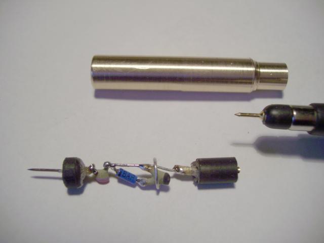 Als ich einige Messungen in einer einfachen HF-Verstärkerschaltung (ein Transistor, Collector an Betriebsspannung, Spannungsteiler an der Basis, Induktivität und Widerstand vom Emitter nach Masse) vornahm, zeigte mir mein Oszilloskop (50MHz) nur Gleichspannungen an: Collector: 12V, ok, Basis: 6V, ok, Emitter: 8V. Nanu? Seit wann kann bei dieser Schaltung am Emitter eine höhere Gleichspannung liegen, als an der Basis? Der Transistor ist in Ordnung, und ist auch definitiv ein NPN-Typ! Irgendwas stimmt doch hier nicht! Sollte die Schaltung vielleicht so hochfrequent schwingen, daß mein Oszilloskop "es nicht sieht" ? Hmmm, das lässt sich doch herausbekommen... Eine kleine Schaltung in "fliegender Verdrahtung" könnte das klären: 1pF in Serie zu einer Parallelschaltung einer schnellen Schottky-Diode (BAR28) und 4.7pF war schnell aufgebaut und vor dem Tastkopf angeschlossen. Ergebnis: Am Emitter zeigten sich nun ein paar hundert mV, hinter der Induktivität nur noch etwa 20mV. Ok, der Verstärker schwang also (wie sich später herausstellte auf ca. 800MHz). Die kleine Demodulator-Schaltung erwiess sich doch äusserst nützlich! Jedoch der Aufbau war doch "etwas unhandlich" und die notwendige Masseleitung "echt lästig". Das lässt sich doch bestimmt eleganter aufbauen...