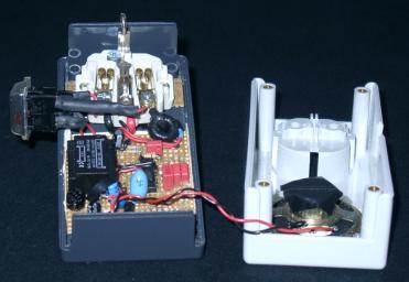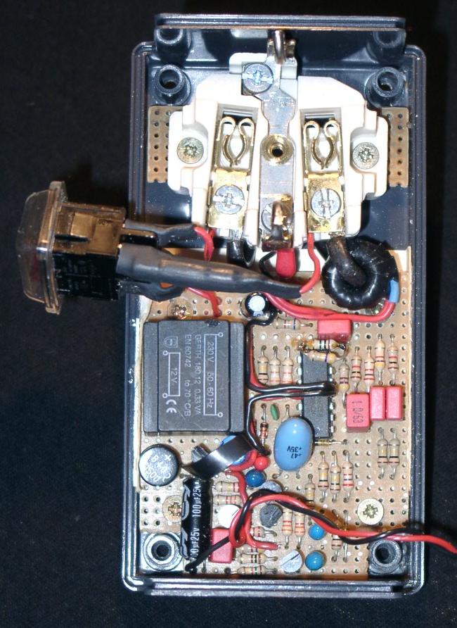 Bei den ersten Tests zeigt sich ein recht eigentümliches Verhalten des Gerätes: In den meiste Fällen funktioniert die Schaltung recht gut, nur in einigen Steckerleisten signalisiert es selbst ohne eingesteckten Verbraucher überhaupt nicht. Nach ein paar Versuchen stand fest, daß dieser Effekt nur auftrat, wenn das Gehäse aufgrund der Anordnung der Anschlußdosen längst der Steckerleiste eingesteckt war. Hier bestand also wahrscheinlich eine kapazitive Kopplung zwischen den in der Steckerleiste verlegten Leitungen und den Leiterbahnen des Eingangsfilters. An diese Möglickeit hatte ich beim Erstellen des Layout nun überhaupt nicht gedacht. Also habe ich die Platine wieder ausgebaut und etwas Schaltlitze auf ein Stück Alufolie gelötet. Die Folie nahm - entgegen einiger Behauptungen, Aluminium wäere nur sehr schlecht lötbar - das Lötzinn recht gut an, nachdem ich etwas Kupferpulver (Schleifstaub) auf die zu verzinnende Stelle gestreut hatte (Zufall ??). Diese Folie habe ich dann in das Gehäuse (unterhalb der Leiterplatte) geklebt und mit Hilfe eines exakt zugeschnittenem Stücks dünner Pappe gegen mögliche Kurzschlüsse gesichert. Nach erneutem Einbau der Platine und Verbinden der "Abschirmleitung" mit der Masseleitung zeigte sich kein störender Einfluss mehr. Nur die Empfindlichkeit der Konstruktion liess etwas zu wünschen übrig (die Ansprechschwelle lag bei ca. 40W). Nach den Erfahrungen mit der kapazitiven Kopplung schien mir eine Erhöhung der Verstärkung nicht grad ratsam. Also muss das Ausgangsignal meines Stromwandlers grösser werden ! Also nochmal 200 Windungen auf den Ringkern wickeln ? Aber bitte mit einem anderen Verfahren als die ersten 200 Windungen (die ich immernoch in schlechter Erinnerung habe) ! Recherchen über die Funktionsweise von Automaten, mit denen industriell Ringkerne bewickelt werden, brachten mich nicht sonderlich weiter (das Verfahren mit der auftrennbaren "Zwischenspule", von der aus dann der eigentliche Ringkern bewickelt wird, ist im "Heimbereich" nur schwer realisierbar). Aber vielleicht der Vorschlag eines freundlichen OMs in der abendliche 2m-Runde, der mir riet, es mal mit mit einer "Anleihe" bei den Webern zu versuchen ? Dieser Hinweis schien mir zuerst etwas seltsam, brachte mich aber doch zu einer halbwegs praktikablen Methode: Wenn ich in ein Stückchen Rundholz (ca. 3mm Durchmesser, 40mm lang) an den Stirnseiten ca. 5mm tiefe und gut 1mm breite Kerben feile, kann ich darauf die ca. 4m Draht aufwickeln, die ich für 200 weitere Ringkernwindungen benötige. Und das so bewickelte "Weberschiffchen" lässt sich immernoch bequem durch den Ringkern schieben und verhindert so das elende Verdrehen und Verknoten des restlichen Drahtvorrats. Mit dieser Methode waren recht flott die zusätzlichen Windungen aufgebracht und erhöhten die Ansprechempfindlichkeit auf ca. 25W. Nun noch einen Schalter und eine Sicherung in die Zuleitung der Platine eingebaut (für einen Sicherunghalter war leider kein Platz mehr vorhanden, daher musste die Sicherung in einem Stück Schrumpfschlauch "verschwinden"), den Übergangswiderstand der dicken Verbindungen zwischen Netzstecker und Steckdose noch einmal überprüft, das Gehäuse verschraubt, und fertig war der "Abschalt-Erinnerer":